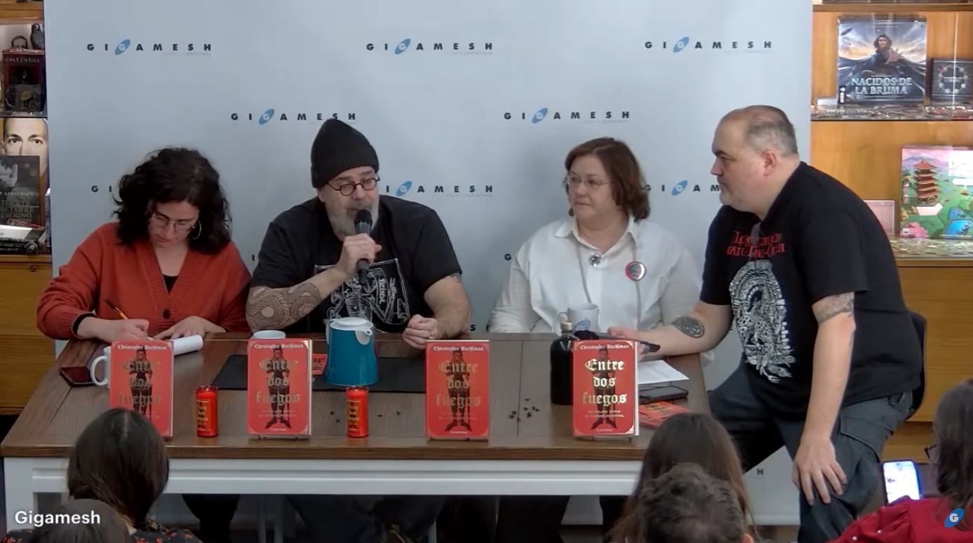 Ayer viernes 13 de febrero tuvo lugar en la Librería Gigamesh la presentación del libro ENTRE DOS FUEGOS de Christopher Buehlman, en el que estuvieron presentes el propio escritor, directamente desde Milán, la editora del sello Oz y del grupo Ático De Los Libros, Claudia Casanova, la traductora (perdonadme pero desconozco su nombre) y como presentador y conductor de la acto Antonio Torrubia, el librero del mal. Con el aforo completo desde hace semanas, todos los presentes y conectados en directo por YouTube tuvimos el placer de disfrutar de una conversación distendida con su autor, un escritor cuya trayectoria literaria está marcada por giros inesperados, reinvenciones creativas y una profunda pasión por la narrativa histórica y fantástica. Entre anécdotas personales, reflexiones sobre el oficio y detalles del proceso creativo, el encuentro permitió conocer tanto el origen de la novela como la evolución de su creador.